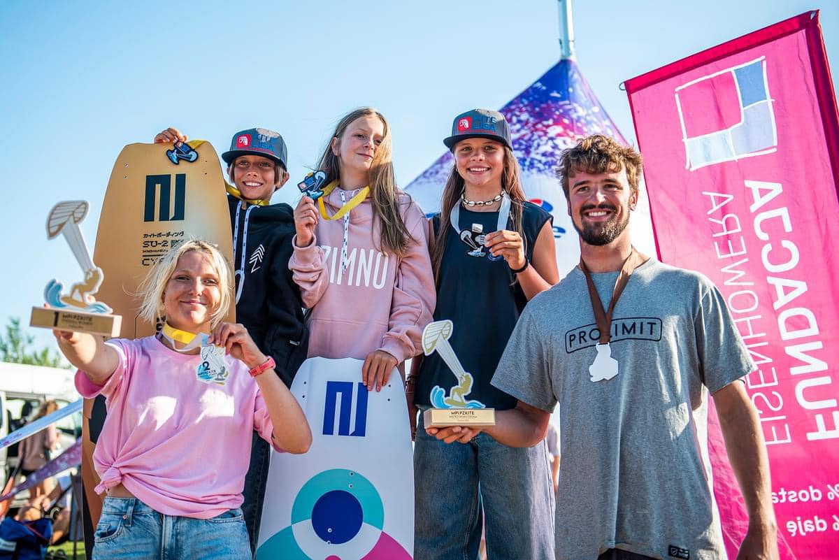 Za szkołą stoją Paula Gałązka i Kacper „Kalafior” Śliwiński — riderzy Slingshot Polska, aktywni zawodnicy i instruktorzy, dla których kitesurfing to nie tylko sport, ale życiowa pasja.
